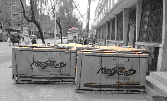 营口市站前区某道路的人行道上横向方向堆放着一排纸壳箱子。略数一下,大概有八九个纸壳箱子。有六七个箱子并排横向笔直的放在人行道上,有两个箱子是单独放在了一边。在一个已经打开的纸壳箱子内,笔者发现箱子里装着的是崭新的摩托车。